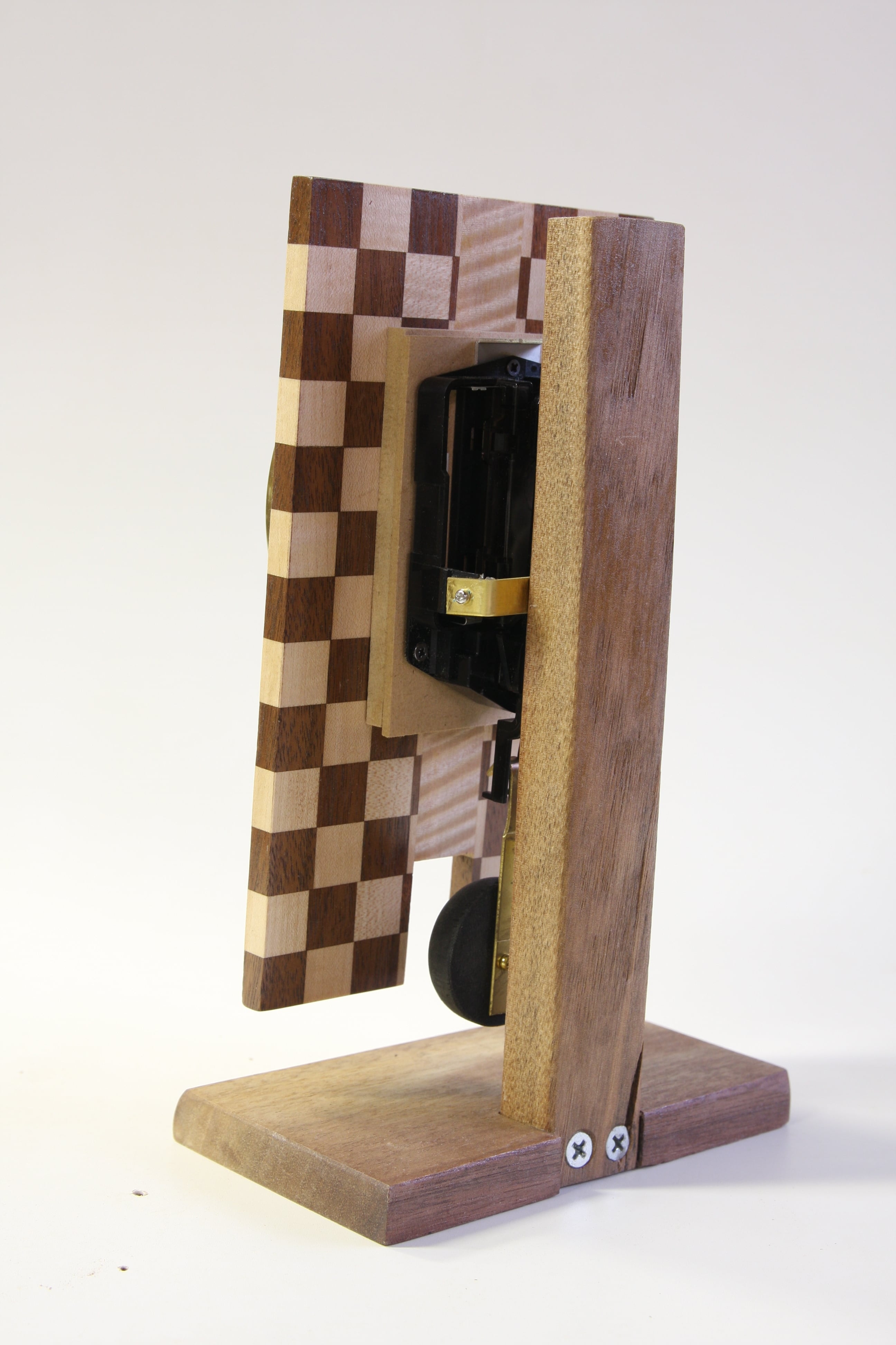 2種類の木を使ったチェック柄の板の隙間から、小さな振子が動く様子がかわいらしい時計です。